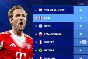 凯恩生涯67场欧冠进51球,相同场次进球数仅次于范尼,与梅西相同