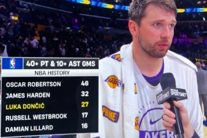 东契奇生涯第27次砍至少40分10助 历史第三多&仅次于大O和哈登