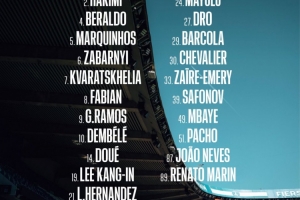 前锋:7-克瓦拉茨赫利亚、9-贡萨洛·拉莫斯、10-登贝莱、14-杜埃、29-巴尔科拉、49-姆巴耶
