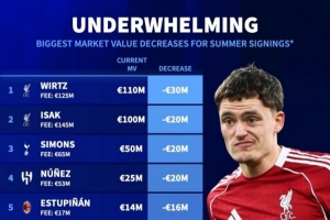 去年夏窗签约球员身价下跌榜: