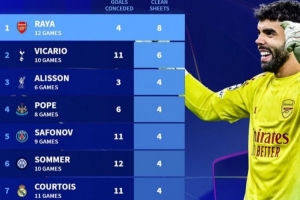 体育资讯4月30日讯 阿森纳在本轮欧冠客场1-1战平马竞,拉亚未能继续零封,但他本赛季依然领跑欧冠零封榜。